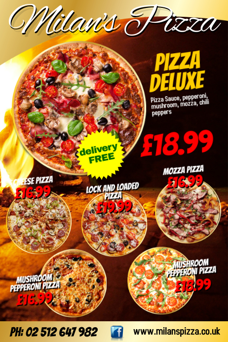 Whether you need a flyer that’s going to include your pizza menu, or a special design for a promo offer, here are 11 great ideas you can learn from Simple pizza flyers If you have a pizza restaurant, it makes sense that this signature dish should be the hero of your flyer design Using stock photos is fine, in case you don’t have high. Since pizza is a universally beloved dish, its quite easy to catch a person's attention with just the image of it Adding images of even a slice can entice your audience to go to your pizza parlor Be sure it doesn't take up a lot of space, in order to add relevant information about your business. Pizza flyers are easy to create Coming up with a pizza flyer is way easier compared to developing a television ad All you need to do is to come up with a theme and realize it by putting together a number of design items and materials Pizza flyers are costefficient.